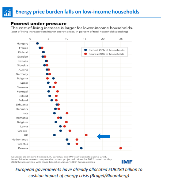 Rightly so in the UK, following the revised energy price cap, there is a focus on whoever is the next Prime minister will need to help those on lower incomes. This is highlighted in the chart below which shows the amount of household disposable income that will be eaten up by the increase in energy prices, with the UK having the widest gap on the impact between richest and poorest 20% of households, with the poorest spending 15% of their net income on energy. Our new Prime Minister cannot ignore the measures needed to soften the blow on the poorest, who will be impacted most, and needs dealing with in a similar way to how the Furlough Scheme helped.